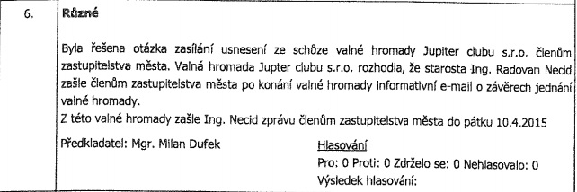 Toto rozhodnutí valné hromady Jupiter clubu bylo přijato bez hlasování členů Rady města (u hlasování jsou vždy nulové výsledky).