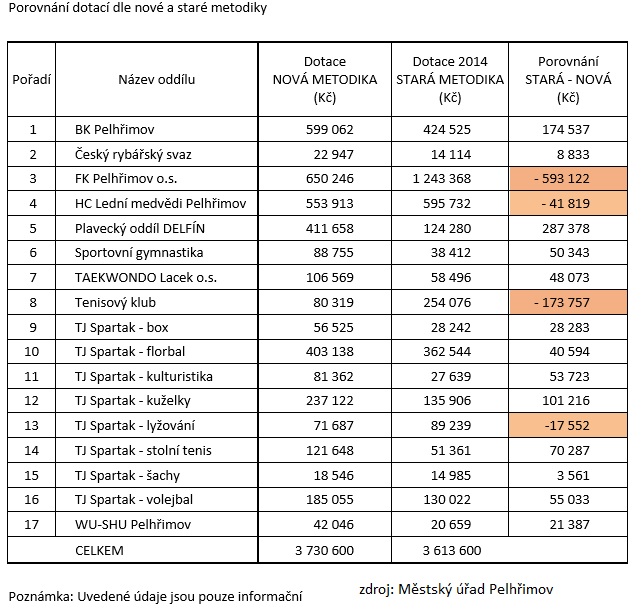 Reforma poskytování finančních příspěvků (dotací) na činnost sportovních oddílů v Pelhřimově prochází reformou. Místostarosta Josef Koch (KDU-ČSL) ani starosta František Kučera (ČSSD) neposkytují k reformě žádné bližší informace. Radnice má zpracovanou tabulku dopadů sportovní reformy na činnost oddílů.Stará a nová koncepce podpory sportu