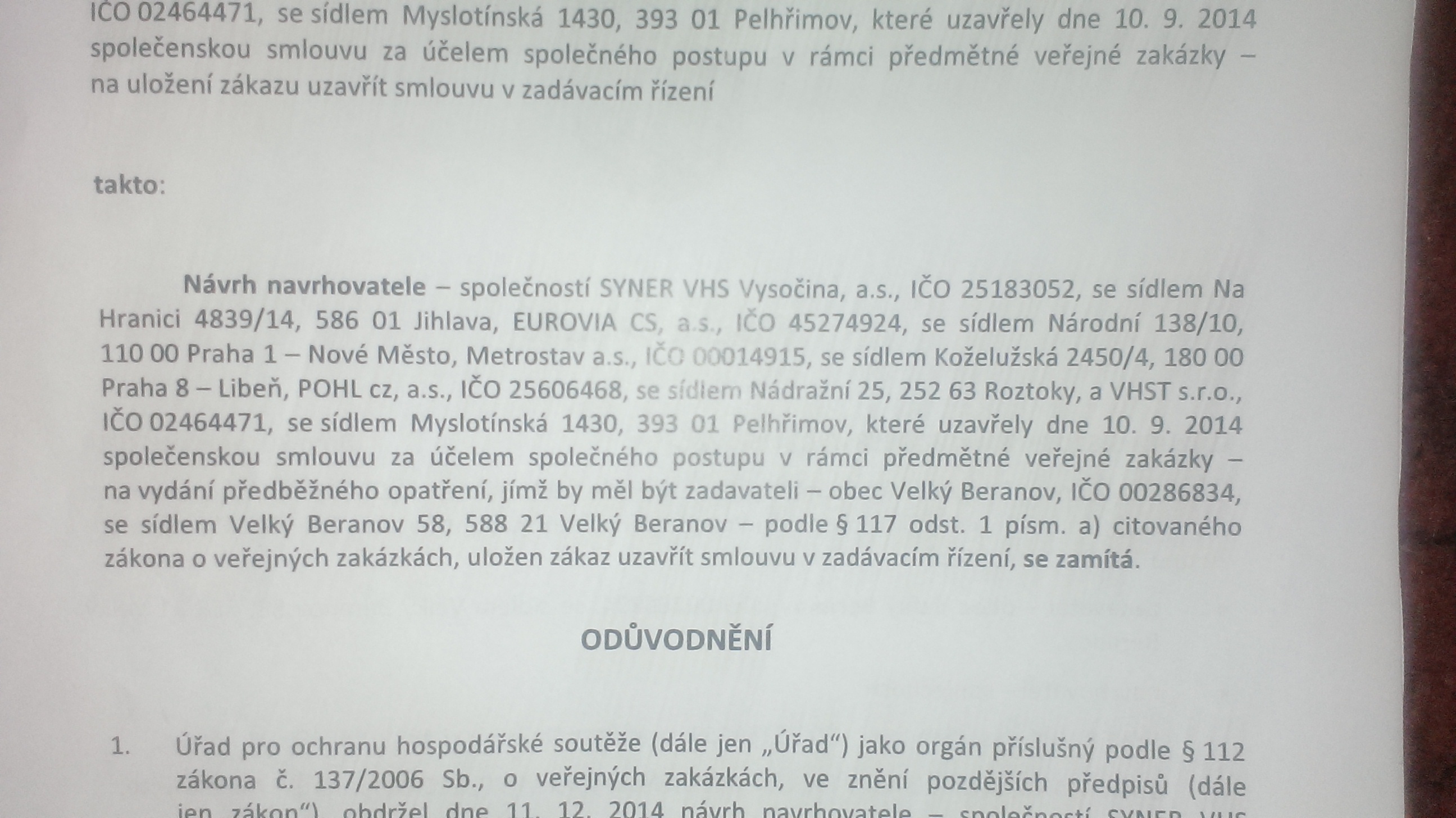 „Úřad pro ochranu hospodářské soutěže ve věci veřejné zakázky „Velký Beranov – kanalizace a ČOV“ žádné předběžné opatření nevydal (17.12.2014 Úřad odeslal účastníkům řízení pouze o oznámení o zahájení řízení). Rozhodnutím ze 30.12.2014 Úřad naopak zamítl vydání předběžného opatření, o něž žádal navrhovatel, protože neshledal důvody pro jeho uložení. Zadavateli tedy v současné době nic nebrání v tom, aby pokračoval v zadávacím řízení,“