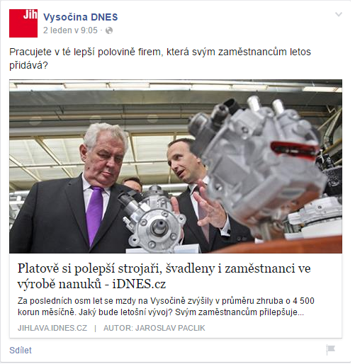 Rozdělování vysočinských firem na lepší a horší už zahájila redakce Vysočina DNES. Na svůj profil v sociální síti umístila odkaz na text: http://jihlava.idnes.cz/platy-na-vysocine-v-roce-2015-d0b-/jihlava-zpravy.aspx?c=A150102_2127828_jihlava-zpravy_mv . Odkaz na text na webu IDNES.CZ propaguje Vysočina Dnes otázkou: „Pracujete v té lepší polovině firem, která svým zaměstnancům letos přidává?“